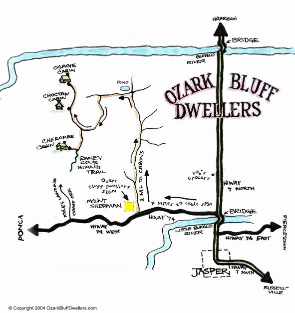 Below are directions on how to get to Ozark Bluff Dwellers Log Cabins
